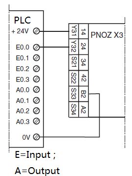 當PNOZ X3處於工作(Active)狀態時,Y31-Y32會閉合,可以使用下面的接線圖將安全繼電器的狀態傳給PLC;