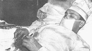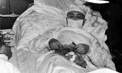 「我也感到十分恐懼,但當我拿起裝滿普魯卡因的注射器為自己注射,自然而然地開始進行手術了,腦子裡再也沒有想別的。」