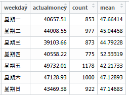 weekdaymoney <-tapply(excelDate$actualmoney,excelDate$wd,sum)weekdaymoney$mean <- weekdaymoney$actualmoney/weekdaymoney$count
