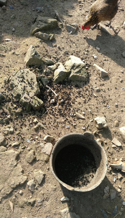 既然蒼蠅弄死了就順便給雞兒們加個餐好了,補點蛋白質好下蛋。