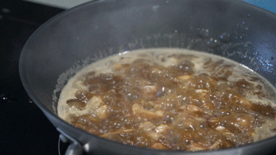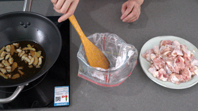 三杯雞的調味步驟是這樣的:先用小火把麻油炒熱,把薑片和蒜仁煸出香味。