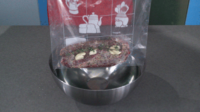 給牛排兩面抹上鹽、黑胡椒和無鹽黃油,然後和蒜瓣、百里香一起放進塑封袋裡,排出塑封袋裡的空氣後,放入冰箱冷藏一晚,此時袋中並沒有液體,最佳的抽真空方法是用吸管吸走袋子里的空氣或利用水壓擠走空氣。由於略有潔癖的C探員拒絕吸入未經烹飪的牛肉分子,於是採用了後者。