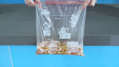 在等油冷的時候,就可以提前架上鍋、打開低溫烹調機,畢竟它要達到指定溫度還要花點時間。等到炒好的佐料和油完全放涼了,就把它和雞腿肉一起一股腦兒倒進塑封袋裡。
