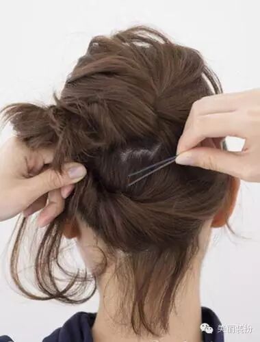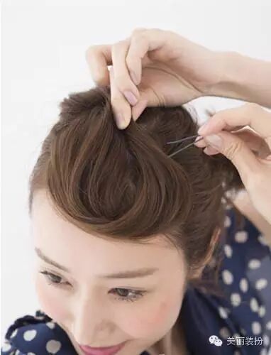 取出前額的劉海纏繞成圓弧狀,再用黑色小髮夾固定。