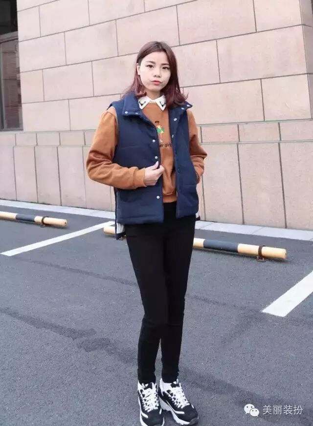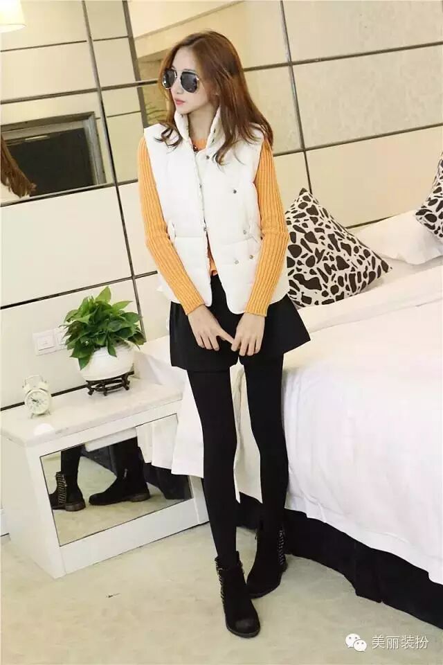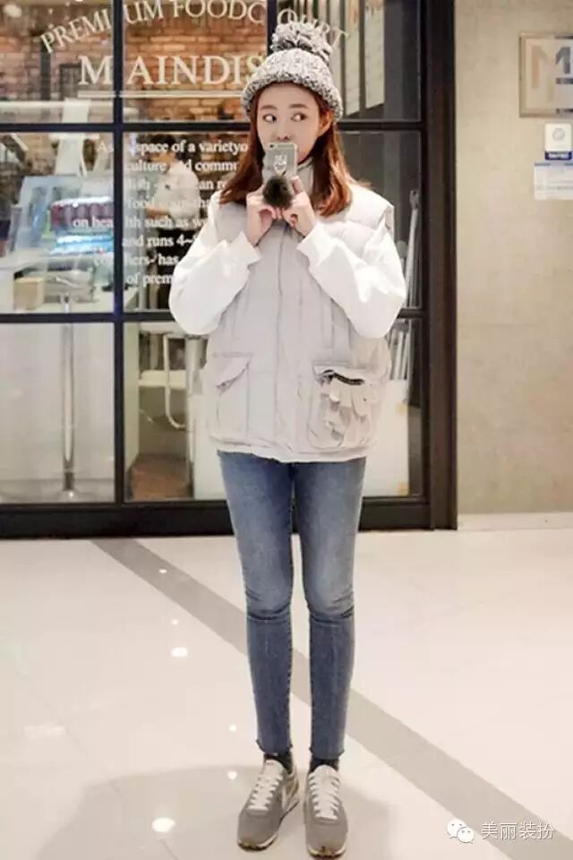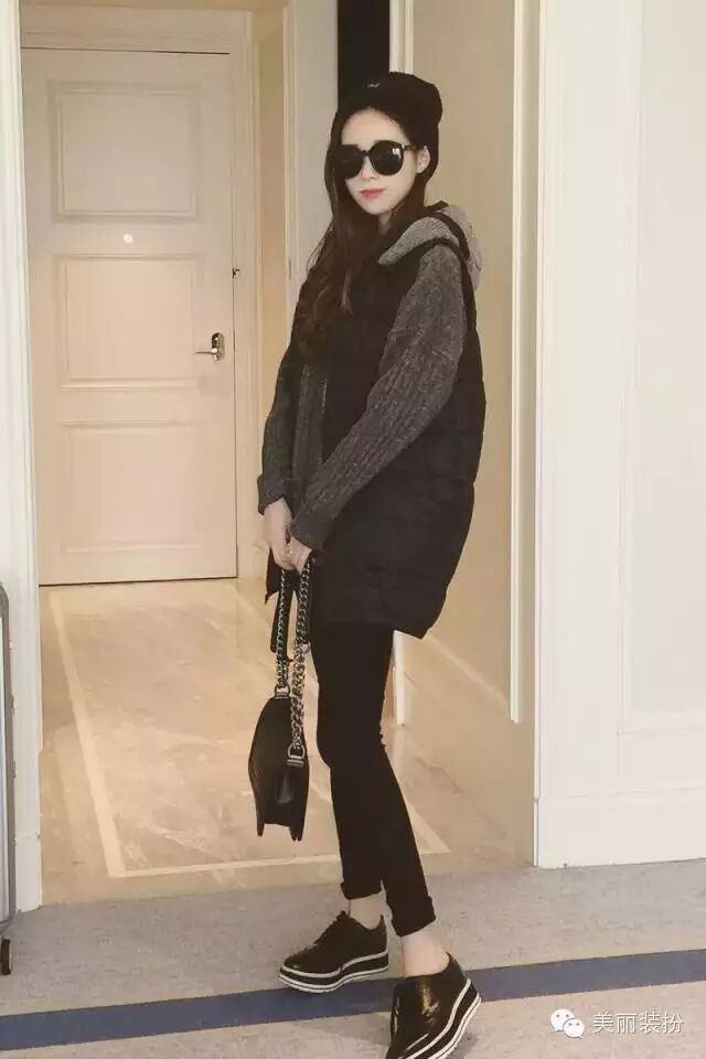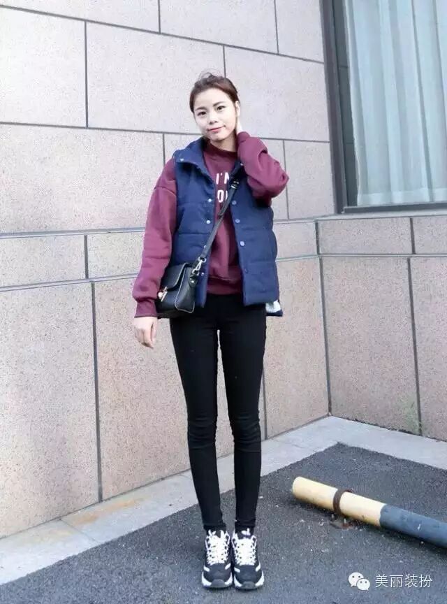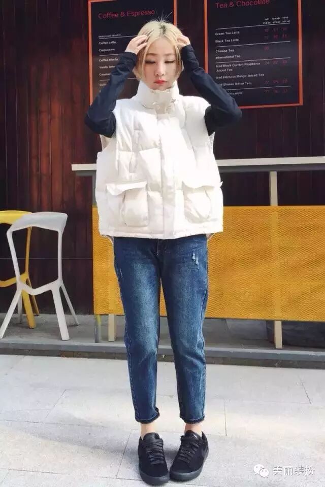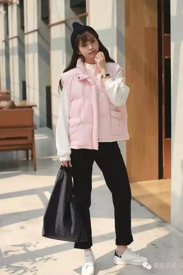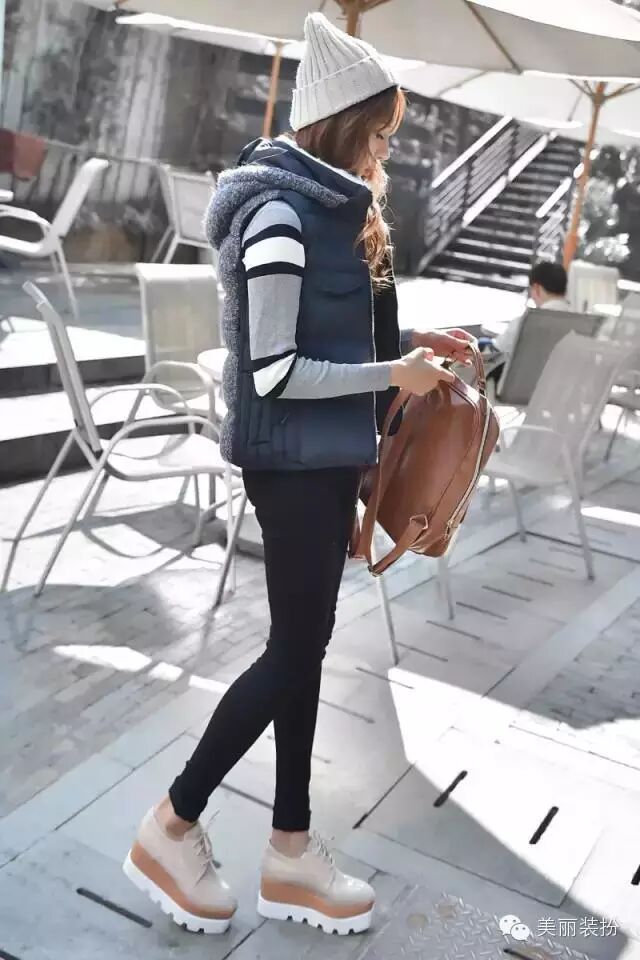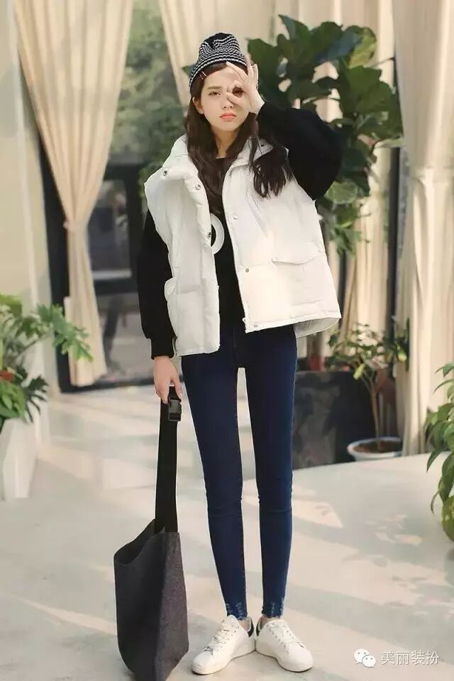 馬甲和衛衣一身看起來俏麗活潑,黑白、黑紅、粉白、粉灰等色調都可以組合,棉馬甲搭配連帽的字母很通俗的一種穿法,韓范兒十足,搭配上小短靴,也是有小女生的甜美氣息的冬裝搭配哦