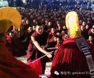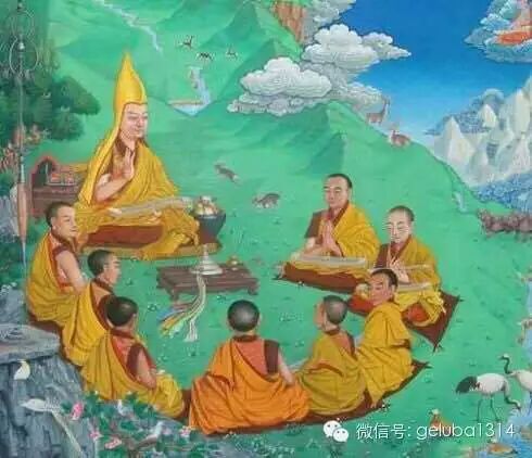 一 格魯派名稱由來格魯派又名甘丹派,都是依著寺廟立名的。因為三界法王宗喀巴大師創建甘丹寺後,晚年長住這個寺中,所以就稱這一派為甘丹派。在藏文習慣的讀法上把甘丹比魯略為"甘魯",一般人稱之為"格魯",以至稱它為"格魯派"了。相沿成習,本無別的用意,並不像後人臆測認為大師有別樹一幟之意。據格魯派大德們的傳說,說法王宗喀巴大師一派,得到甘丹派之名,早在迦當時期,已被預言過。如迦當全集師法第二十六品未來授記品中"最後正法火,由『名稱』重燃,作無量利樂,斯即『勝處士』";指偈中第二句是暗示大師之號,"勝處士"指甘丹派,是由寺名安立宗號之意。西藏後弘期佛教中的盧梅大師,臨赴藏時,拉勤貢巴饒塞大師,贈以自己曾經戴過的黃帽一頂,且囑咐說"汝戴此帽,可憶念我"。由於這件事情,後來持律的大德們,都戴黃帽。當法王宗喀巴大師出世弘化時期,因藏地戒法久衰,有志重興,遂依古代持律大德的密意,也用黃顏色的帽子,作為戒法重興的象徵,並且成為一家的標幟,因此,稱大師一派為黃帽派。