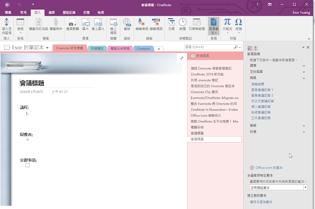 13. 內建商務、學習筆記範本我在介紹 Evernote 筆記方法時,常常說要幫自己建立常用的筆記格式範本,這樣下次同樣工作直接套用即可,例如:開會浪費時間?用特製會議記錄格式開一次有效會議、九宮格筆記法 Evernote 實作,跳脫直線的表格思考術等筆記法中,我都提供了筆記範本給大家下載。而在 OneNote 2016 裡,就像 Office 的 PowerPoint 範本、 Excel 範本一樣, 也內建了不少的商務開會筆記、學習考試筆記範本,裡面甚至還有三分割筆記法,可以直接套用。