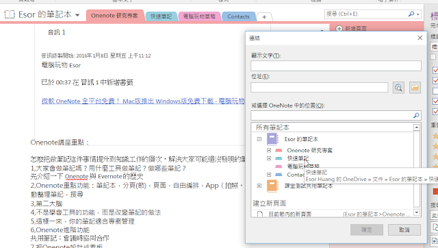 9. 更快速的筆記連結目錄整理:快速搜尋並插入連結前面講到了筆記連結的好用之處, OneNote 2016 for Windows 還具備一個很棒的插入筆記連結的方法,就是在想要插入連結的地方直接點擊右鍵,選擇要插入連結,這時候可以在彈出小視窗直接搜尋到該則筆記,直接插入該則筆記連結。這樣就不用兩三則筆記反覆來回去複製貼上了。