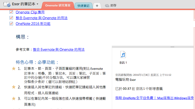 接下來我就要介紹幾個只在 OneNote Windows 版,甚至是 OneNote 2016 Windows 版才有的優秀筆記功能。