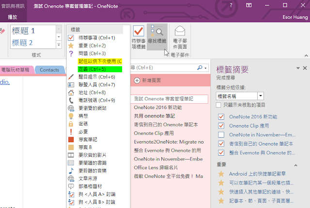 第一個是 OneNote 的標籤搜尋, OneNote 的標籤和 Evernote 的標籤功能有很大不同, OneNote 的標籤比較像是針對內容的圖示說明,我們可以把標籤插入在筆記內文的任何地方。OneNote 內建了很多基本的標籤,例如待辦事項核取方塊、重要星號、問題問題等等,我就在筆記內文覺得適合這個說明的地方,貼上這個標籤圖示即可。
