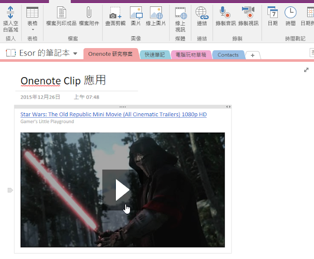 10. 筆記內插入可播放的線上影片OneNote 2016 還能在筆記內嵌 YouTube 等線上影片網站的播放器,只要在插入時選擇插入線上視訊,加上影片網址,就會自動生成播放器。而且這個影片是可以直接在 OneNote 筆記內播放的!