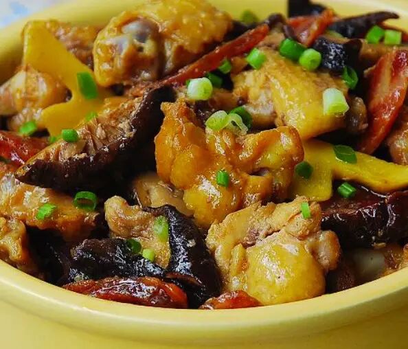 將臘腸片、香菇條拌入腌制好的雞塊中,裝入平盤中,擺上香蔥段大火蒸15分鐘即可。