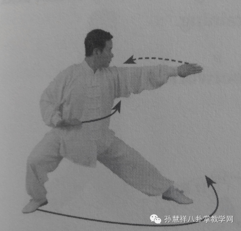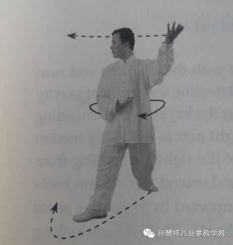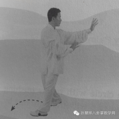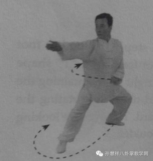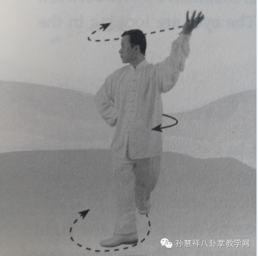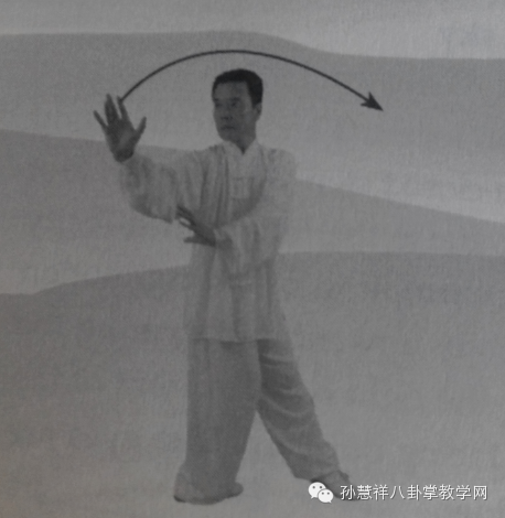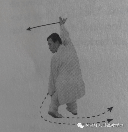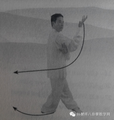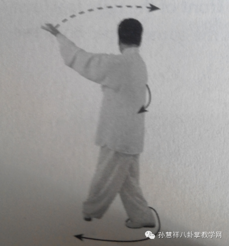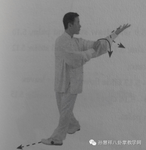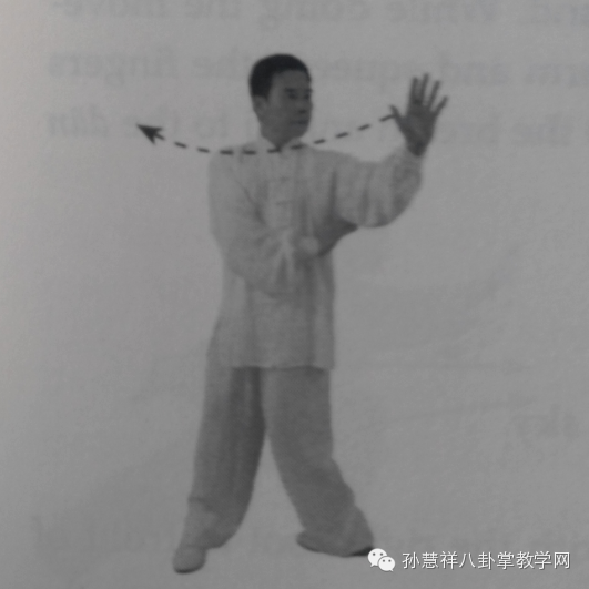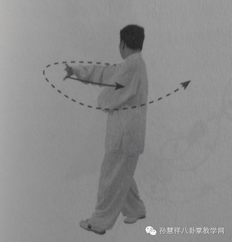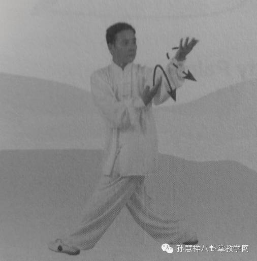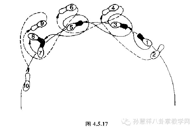 當左手指向圈心時,左腳擺順,歸於行樁姿勢。隨之兩掌挑動畫弧。兩臂同時內旋。兩掌向外搨掌(4.5.16)。