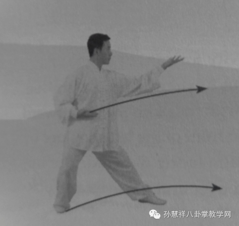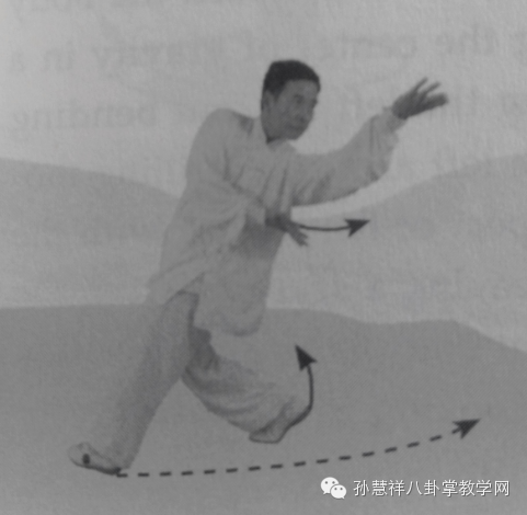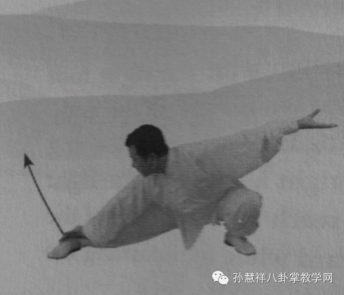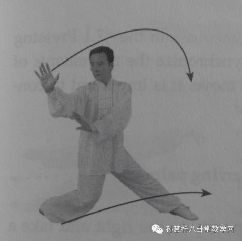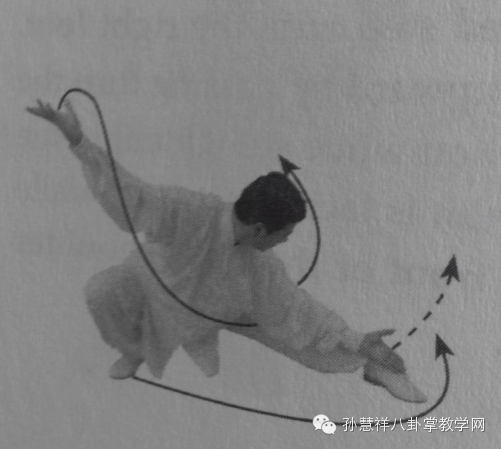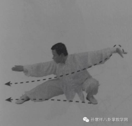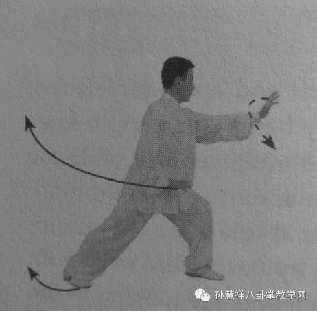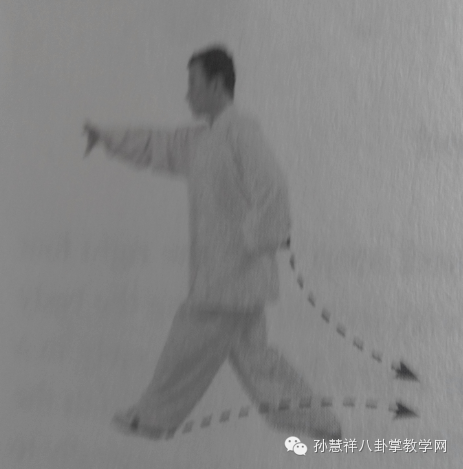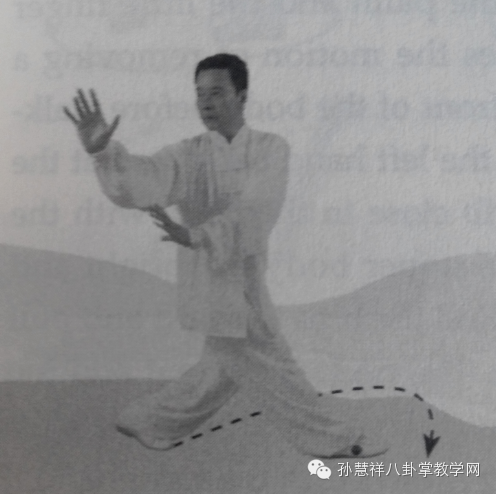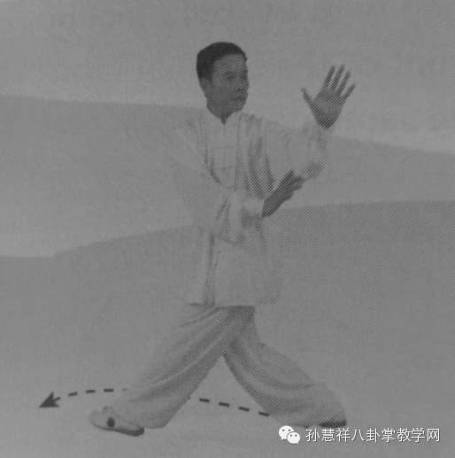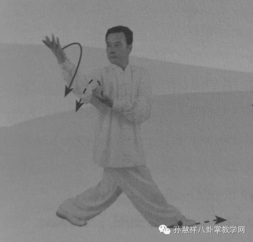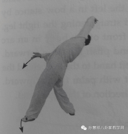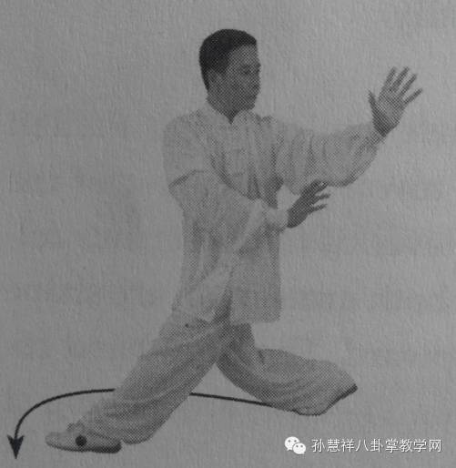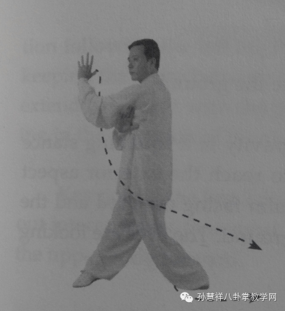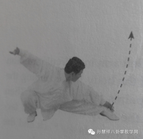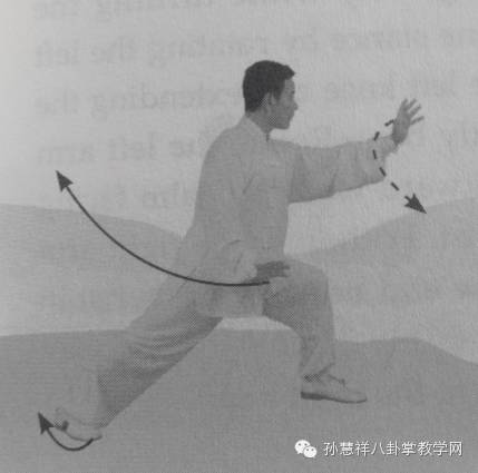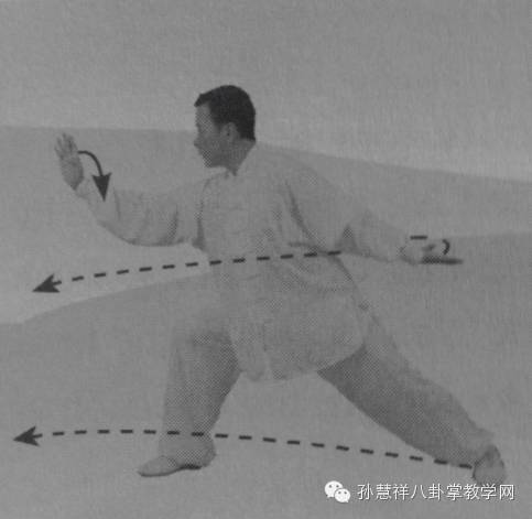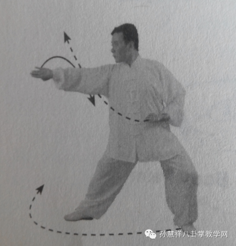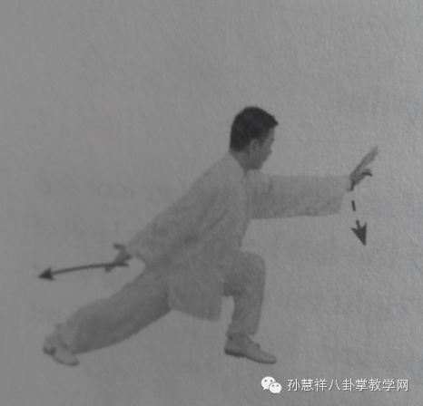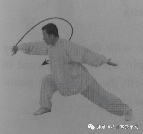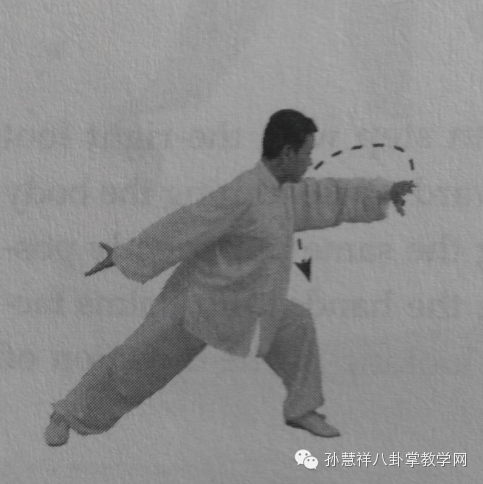 (2)右手四指併攏,拇指半屈,屈至掌心。掌心向後偏上,順右腿外側挑出。右腿弓膝。重心向前移動的同時,左腳調順,左腿挺直。