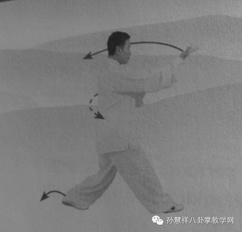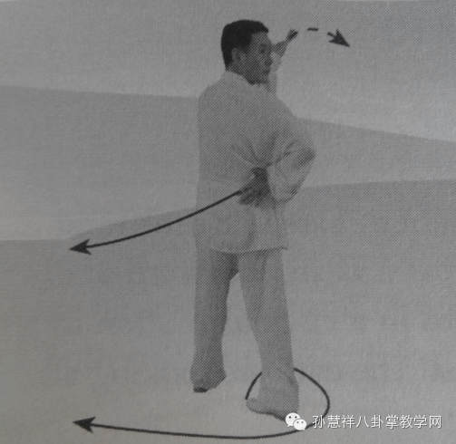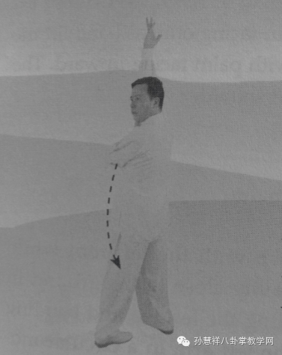 (2)右手於右側腰隨轉體而動,碗頂右側腰部.掌心向外。