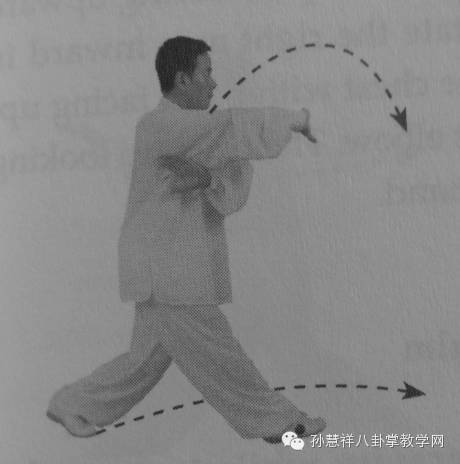 (1)左腳進步,過扣步,扣至右腳前,見步型「過扣步』的要求。
