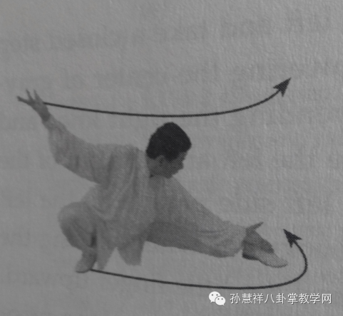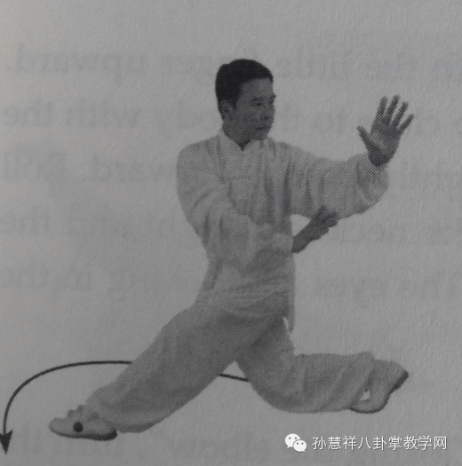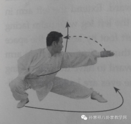 6.擺步掛掌 左腳向後擺步,落於圈線.腳尖外展.左手跟隨左腳一起迴旋。虎門撐圓,掌心向斜上方向,放於左腳之前,左膝及左臂稍有彎曲,右腿下蹲。上體向左腳方向傾斜,右手指向斜上方向。肘部稍彎.掌心向斜上方向。兩目正視左手方向(圖4.6.7)