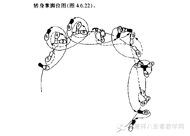 18.翻手搨掌 右手向外挑動畫弧,兩臂內旋,兩手同時搨掌,當右手指向圓心時,歸於走圈推轉掌姿勢。順圈而走(圖4.6.21)要點:回身撞,力發於肩;走馬活攜.指尖領先,向後盤旋.好像將個圓柱體提夾於腋下的動作,同時旋腰,眼隨手動,順圈而行,步數不限。
