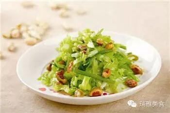 2 將圓白菜細絲、芹菜段放在一個乾淨無水的小盆里,倒上食用橄欖油、鹽拌均,撒上開心果,淋上香油即可。