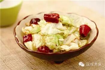 3 油鍋燒熱,放入蒜末和紅尖椒末爆香,加入圓白菜片。
