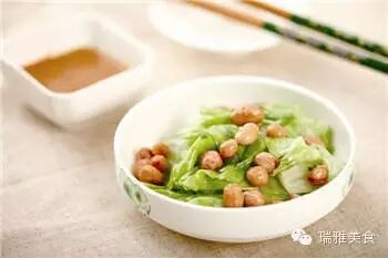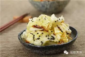 3 將已經汆燙好的圓白菜片放入盆內,調入鹽、醋、生抽、香油拌勻。最後入麻辣花生拌勻即成。
