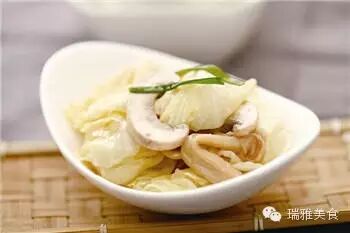 1 圓白菜洗凈,切片;鮮蘑菇洗凈,去蒂,切片,備用。