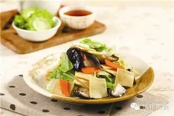 1 豆皮切塊;圓白菜洗凈切片;胡蘿蔔切片;香菇泡軟切片;蔥切段;姜切片,備用。