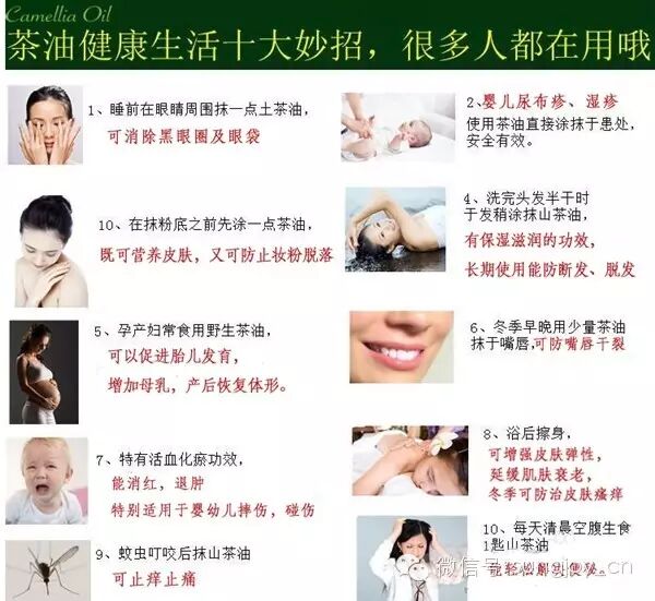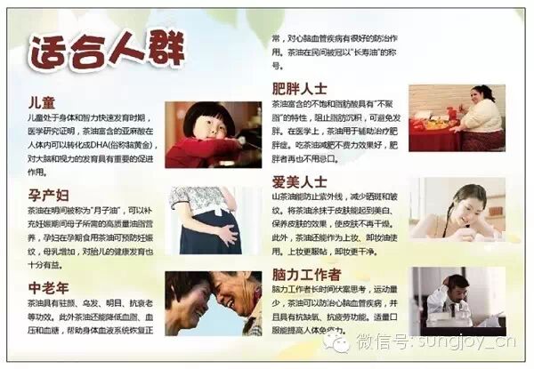高山茶油由於富含特有的營養成份,對胎兒、嬰兒、中小學生都有著特別的關愛。孕婦吃茶油對胎兒腦部發育很有益處;山茶油是最近似於人奶的自然脂肪,嬰兒吃了可使其健康成長;學生吃茶油可增強思考力和記憶力。