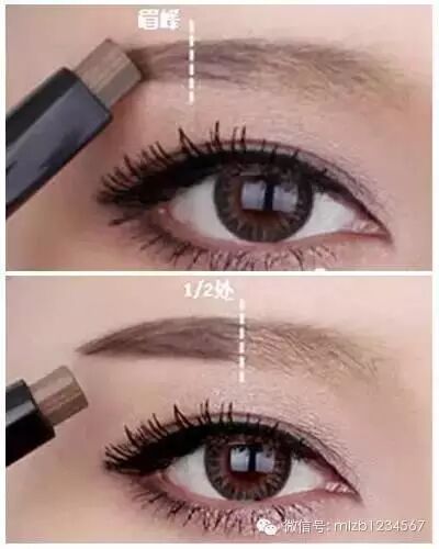 Step 2:將眉筆平放在眉毛1/2處,順著眉毛生長的方向描繪眉形,在眉峰處停筆,打造出圓潤的眉峰。