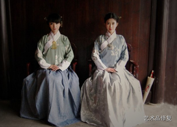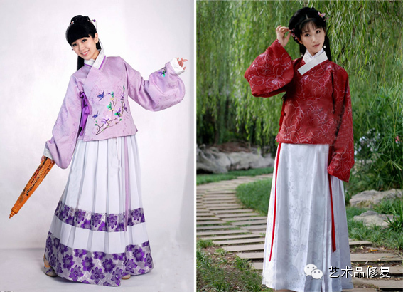 直領襦裙,又稱對襟襦裙,下圖兩個妹子的上衣,里有內襯,衣領沒有交疊: