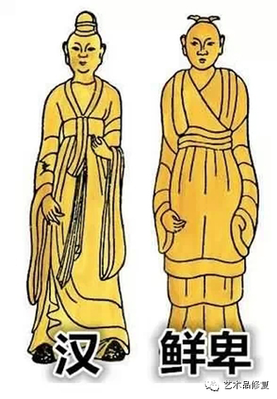 其中漢服最大的特點是交領右衽,就是指衣襟向右掩,在他們看來前襟呈「y」型。而一些少數民族有左衽的習慣,與漢服不同。 通過漢族服飾陶俑和鮮卑族服飾陶俑的對比,可以看出鮮卑服飾是左衽,為反向的「y」型。