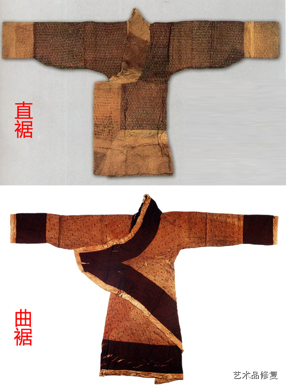 這是漢代古墓出土的兩款衣服,可以看出曲裾要在裙擺那裡繞一群,而直裾是不繞的。注意下擺沒有纏繞: