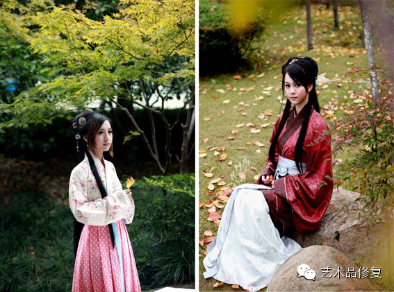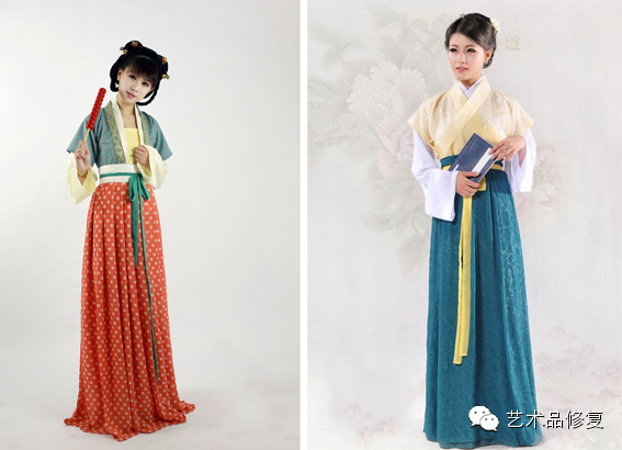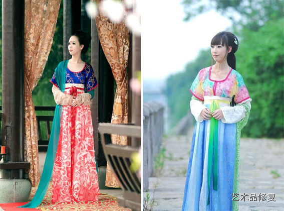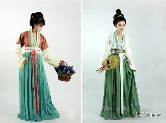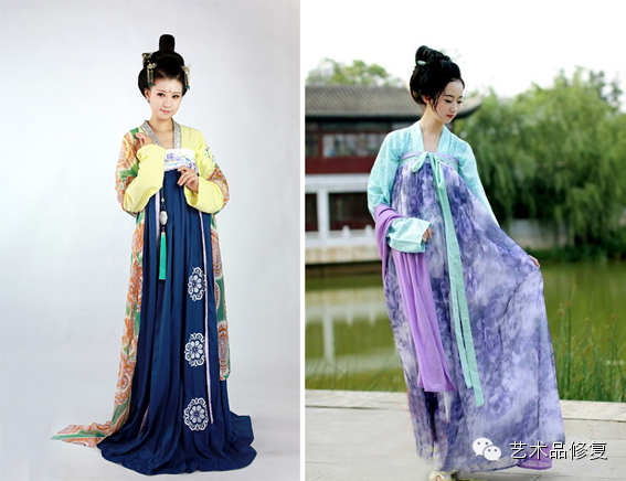 齊腰襦裙,裙子系在腰間。從周代至明朝都有穿著,可謂經典流行款。高腰襦裙,系帶高於腰,低於胸。此款魏晉南北朝開始流行。下圖的款式,就是唐制袒領襦裙,可以露出胸口,這算是所有款式漢服中最裸露部分最大的了,根據衣料材質的不同,氣質自然也就不同,樸素清新還是雍容華貴就看家裡差不差錢了,對比一下很明顯: