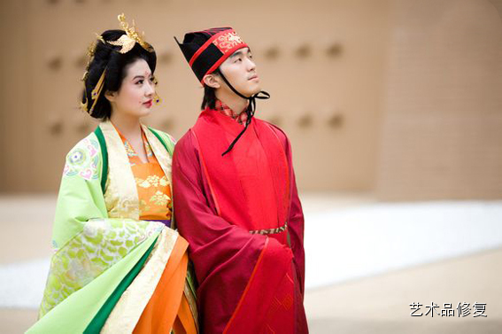 唐制婚服,男子用紅色公服,這被認為紅色婚服的起源。女服以青色深衣,飾以金銀琉璃等釵飾。大膽的色配衝撞展示絢麗的大唐氣象,也造就了」紅男綠女「的成語。魏晉合此制。
