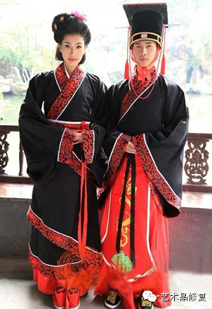 端莊而又俏皮。 除了玄端和冕服,無論是王公貴族還是平頭百姓皆可穿著。 與常服區別的就是禮服。皇室的典禮繁多且複雜,無論是祭祖、祭天、打仗或者各個節日都要穿著不同色彩與款式的服飾進行儀式,對於普通百姓來說華而不實,對於今人了解也缺少參考,就選婚禮這一最有代表性的儀式來說一下漢服款式的轉變。 周代時,婚禮稱作「昏禮」,取意」黃昏舉禮「。周制婚服也不是現在人們誤解的大紅一片,而是玄色禮服,這個」玄「字,就是說黑中揚紅的顏色。秦漢皆沿用此制。