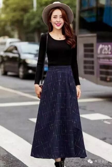穿上一款黑色修身長袖t恤,將好身材秀出來,再搭配一條藏藍色格紋毛呢半身裙,腳上穿黑色高跟靴,拉長身材比例,顯瘦顯高的效果很好。