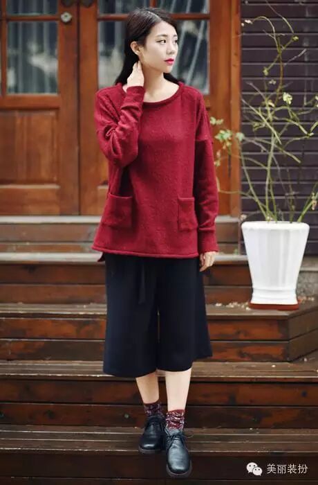 ◆◆復古寬鬆毛衣+復古闊腿褲+森系英倫單鞋◆◆酒紅色針織毛衣,極寬鬆的版型,卷邊大圓領,不規則下擺,大大的口袋,簡約清新,下搭闊腿褲,舒適的英倫單鞋,清爽乾淨。