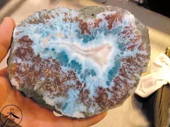 海紋石,石如其名,有著海洋般的藍色,以及藍綠色夾白色的海水泛波形態,在光的作用下,呈斑塊格紋的幾何美。這種美麗而珍稀的礦石,據說,全世界唯一的產地,只有多明尼加了