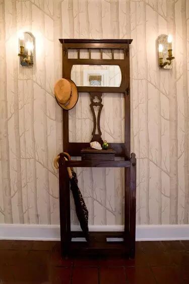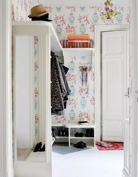 素雅的玄關背景設計,椅子的樣式也非常古典。再簡陋的門廳也得考慮到家人出入的收納及便捷,可以隨意移動的玄關椅子成了出入不錯的好幫手。三角的牆角空間不需要鞋櫃也能隨意放上鞋子。加上牆壁上的掛鉤收納,更是錦上添花。