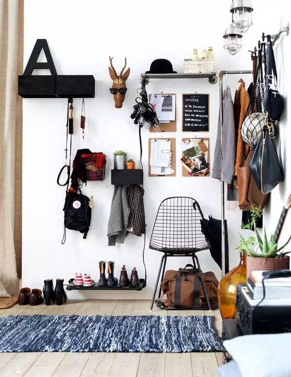 簡單的創意,就能實現很好收納。安裝簡易的掛鉤設計,讓收納變得樂活多變,即便是掛滿了衣服、帽子與包包,也看起來十分井然有序。再沒有空間,總能容納幾個掛鉤和擱架吧~牆上空間利用起來!