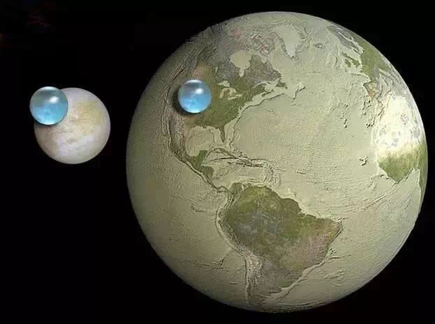 15.左是木星衛星「木衛二」(Europa)上的水量,右則是地球上的水量。