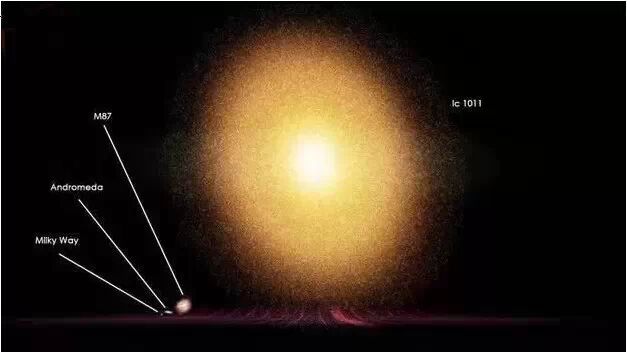 左到右:銀河系、仙女座星系Andromeda、室女A星系m87、IC-1011星系