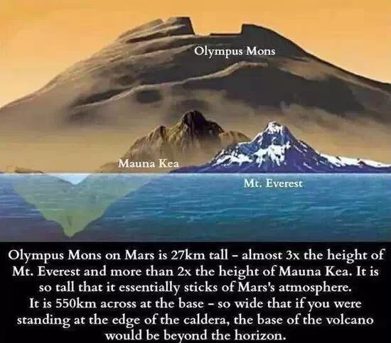 奧林帕斯山有27公里高,幾乎是聖母峰的3倍高,也比毛納基火山(從水底山腳計算)的2倍還要高。奧林帕斯山已經高聳進火星的大氣層了。它的基底有550公里那麼寬廣,也就是說,如果你站在火山口來看的話,它的山腳會一路綿延超過地平線。