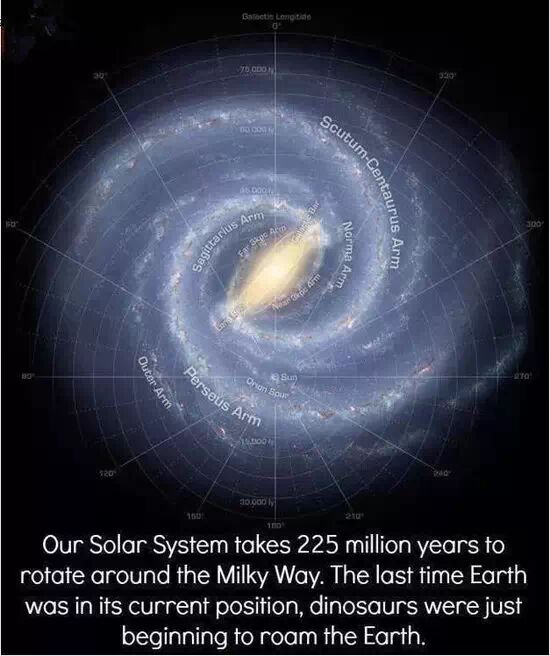 我們的太陽系會花上2.25億年繞行銀河系,上一次地球在同一個位置的時候,恐龍都還存在著。
