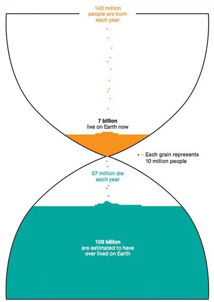 上圖每一個點就是1000萬人,每年有1.4億人誕生,現在有7億人口,每年有5700萬個人死亡。