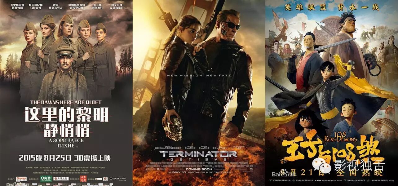 近幾年俄國片在影市出現頻率提高,八月3部引進片就有兩部是俄國片。2012年在俄國上映的動畫電影《冰雪女王》今年8月3日在中國上映,僅獲得320萬票房,文化交流的意義大於商業意義。而8月25日上映的《這裡的黎明靜悄悄》明顯是為了紀念世界人民反法西斯勝利70周年外調過來的「獻禮片」,政治意義大於商業意義,唯一一部商業大片就是23日的《終結者5》。