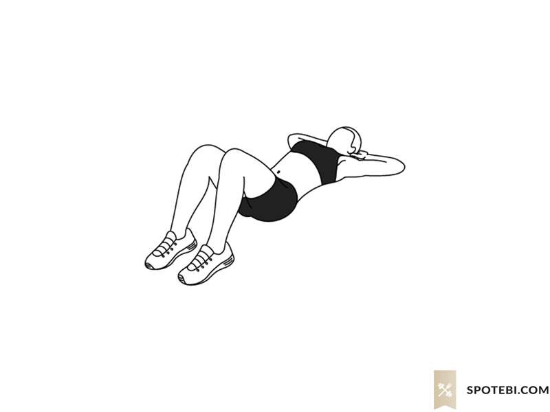 背部保持平坦躺在墊子上,大腿小腿之間呈60度角彎曲於地板上。讓你的腳平放在地板上,把雙手放鬆放於頭部兩側。向前捲曲你的上半身,把你的肩胛骨捲起剛剛離開地面。