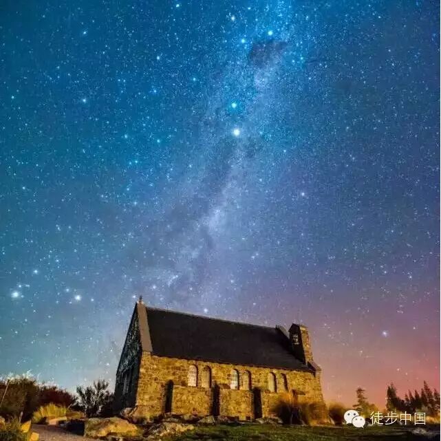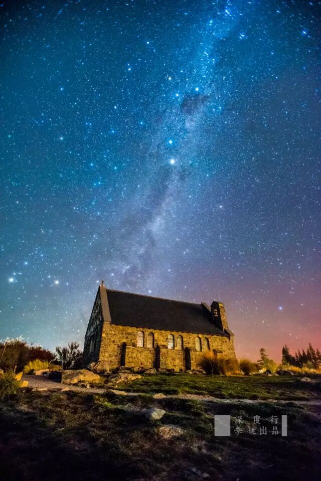 ▲ 教堂銀河,2015年4月16日攝於紐西蘭,尼康D810,17-35/2.8,F2.8,ISO3200,25秒(牧羊人教堂的暖色調光線來自蒂卡普湖邊小鎮上的光污染,而教堂右邊粉色天空則是日落後的微弱餘暉,這兩者結合在一起卻讓畫面更加和諧美麗。假如不是光污染的自然補光,你要在現場給這個教堂補光是一件非常困難的事情。)