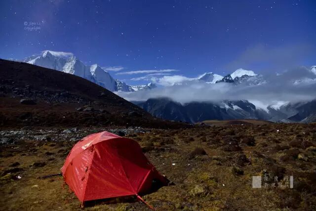 ▲ 月光下的雪山星空,2014年10月4日攝於珠峰東坡錯學人瑪營地,Nikon D610,24-120/4,F4,ISO1600,15秒,途中雪山從左到右分別為馬卡魯、珠穆郎卓、洛子峰和珠峰