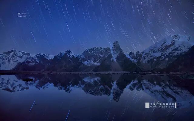▲ 雪山星軌倒影,2014年10月6日拍攝於珠峰東坡錯學人瑪營地,Nikon D610,24-120/4,F4,ISO200,1100.7秒,焦距24mm
